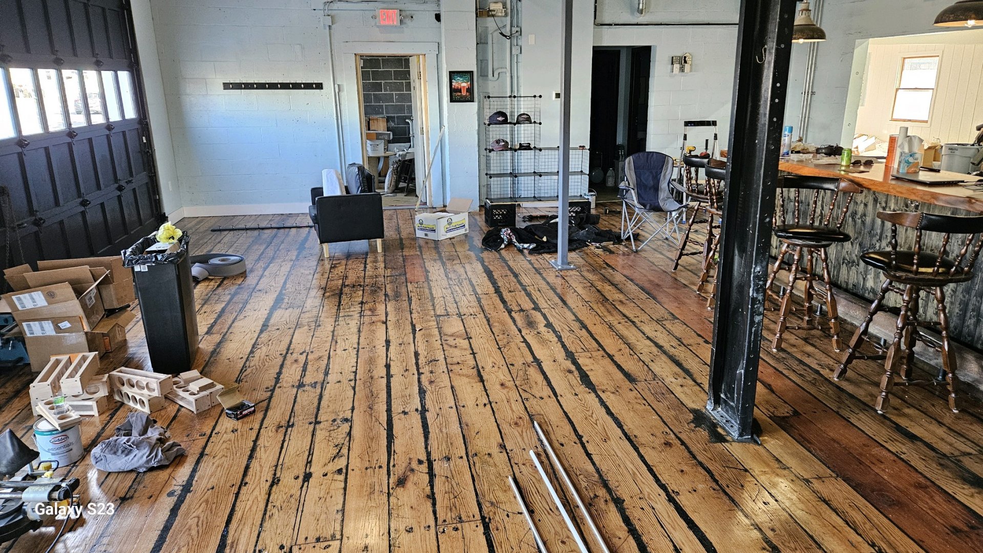 Instead of installing new vinyl plank flooring as originally planned, we suggested they refinish the existing 2” thick aged pine planks, previously used by the mechanic. The result was a one-of-a-kind rustic floor that brought character to the space and saved significantly on materials and labor.